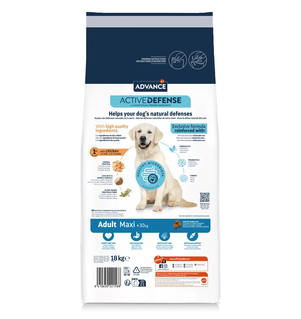 Advance Adult Maxi é um alimento de alta qualidade, fácil de digerir e formulado para atender às necessidades dos cães adultos de grande porte. É elaborado com frango como primeiro ingrediente. Ajuda a manter a massa muscular graças ao teor de proteína de alta qualidade e contribui para uma pele saudável e um pelo brilhante graças aos ácidos gordos ómega 3 e 6.