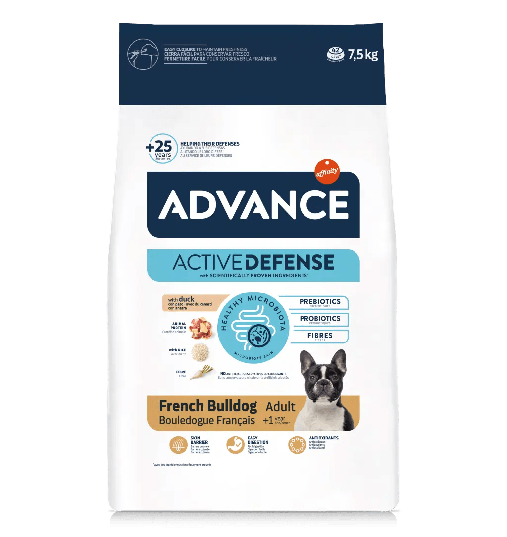 Advance French Bulldog foi especialmente formulado para o cuidado dos cães da raça Buldogue Francês. Uma receita com proteínas alternativas, como o pato e a batata, e com elevada digestibilidade, como o arroz. Contribui para uma pele saudável e um pelo brilhante graças aos ácidos gordos ómega 3 e 6. Além disso, contém antioxidantes para ajudar a neutralizar os radicais livres.