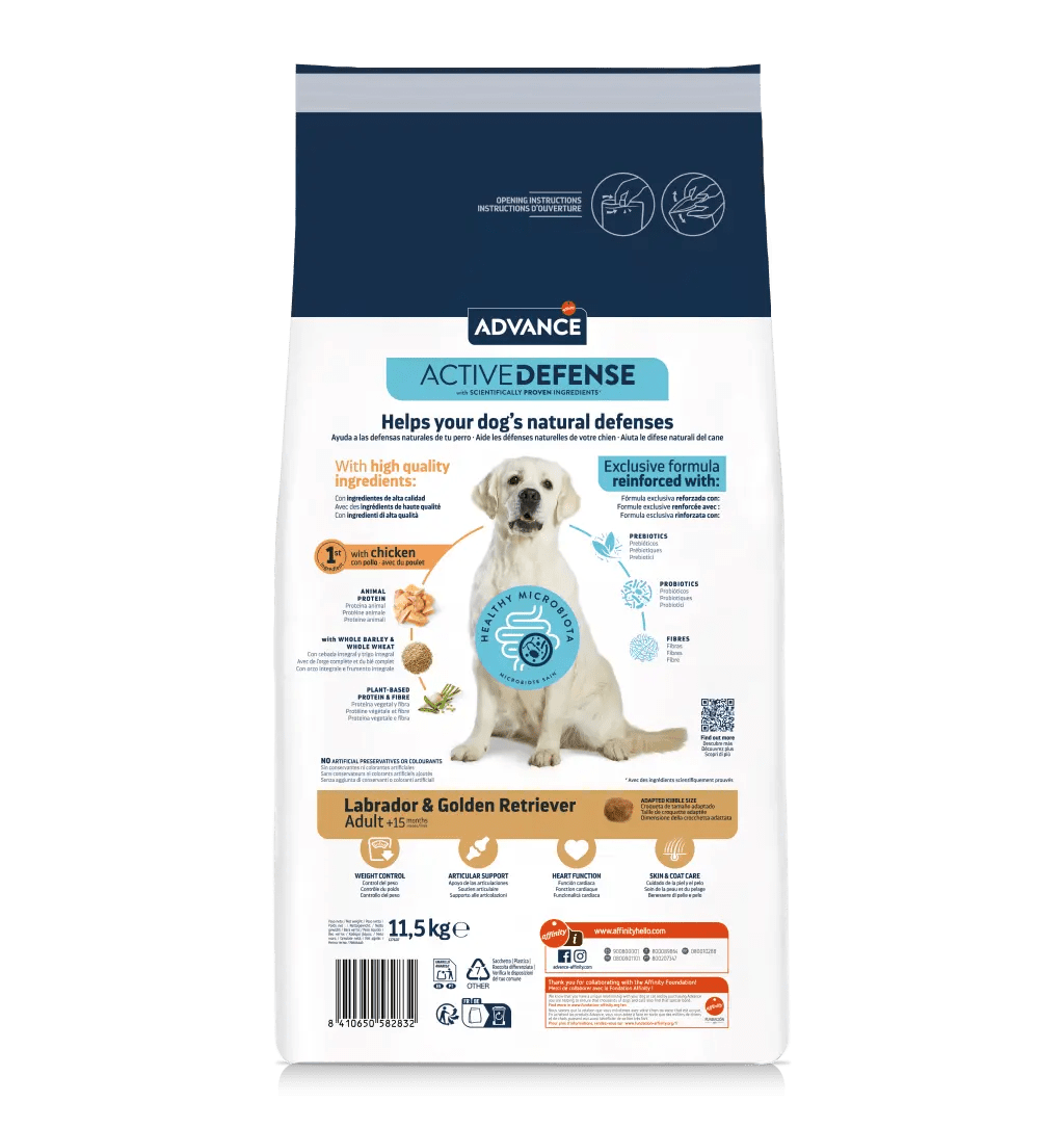 Advance Labrador & Golden Retriever foi especialmente formulado para o cuidado dos cães da raça Labrador e Golden Retriever. Ajuda a controlar o peso graças ao elevado teor de fibra e a uma receita moderada em calorias. Contém condroitina e glucosamina que ajudam a manter a cartilagem articular e taurina e L-carnitina para contribuir para o normal funcionamento do músculo cardíaco. Além disso, contribui para uma pele saudável e um pelo brilhante graças aos ácidos gordos ómega 3 e 6, à biotina e ao zinco.