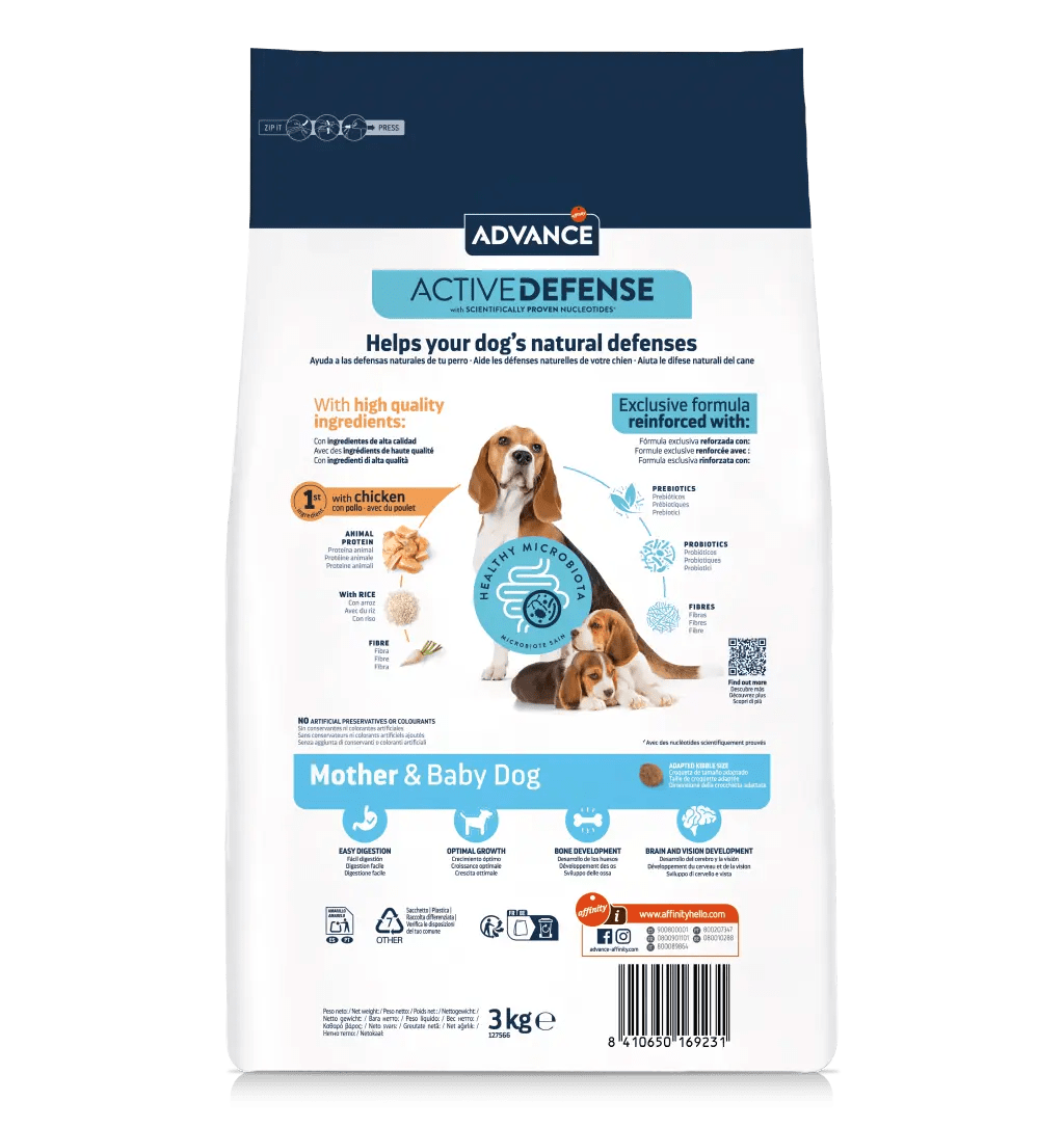 Advance Mother Dog & Baby Dog ajuda as defesas das mães gestantes e lactantes e dos cachorros desde as primeiras semanas. É um alimento fácil de digerir, que contribui para o normal desenvolvimento do cérebro e da visão e para o crescimento saudável do cachorro. Contém nucleótidos que ajudam a manter a resposta imunológica natural.