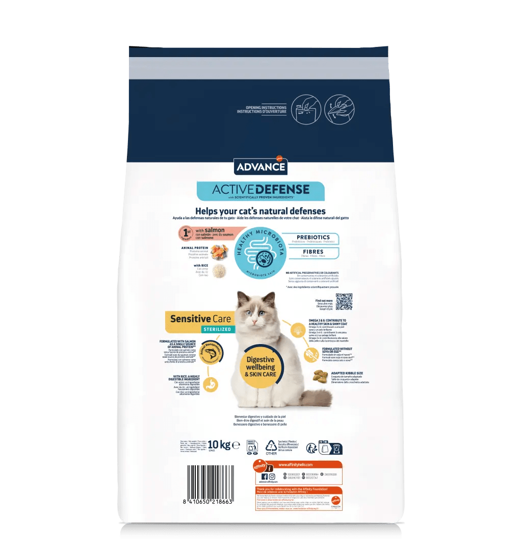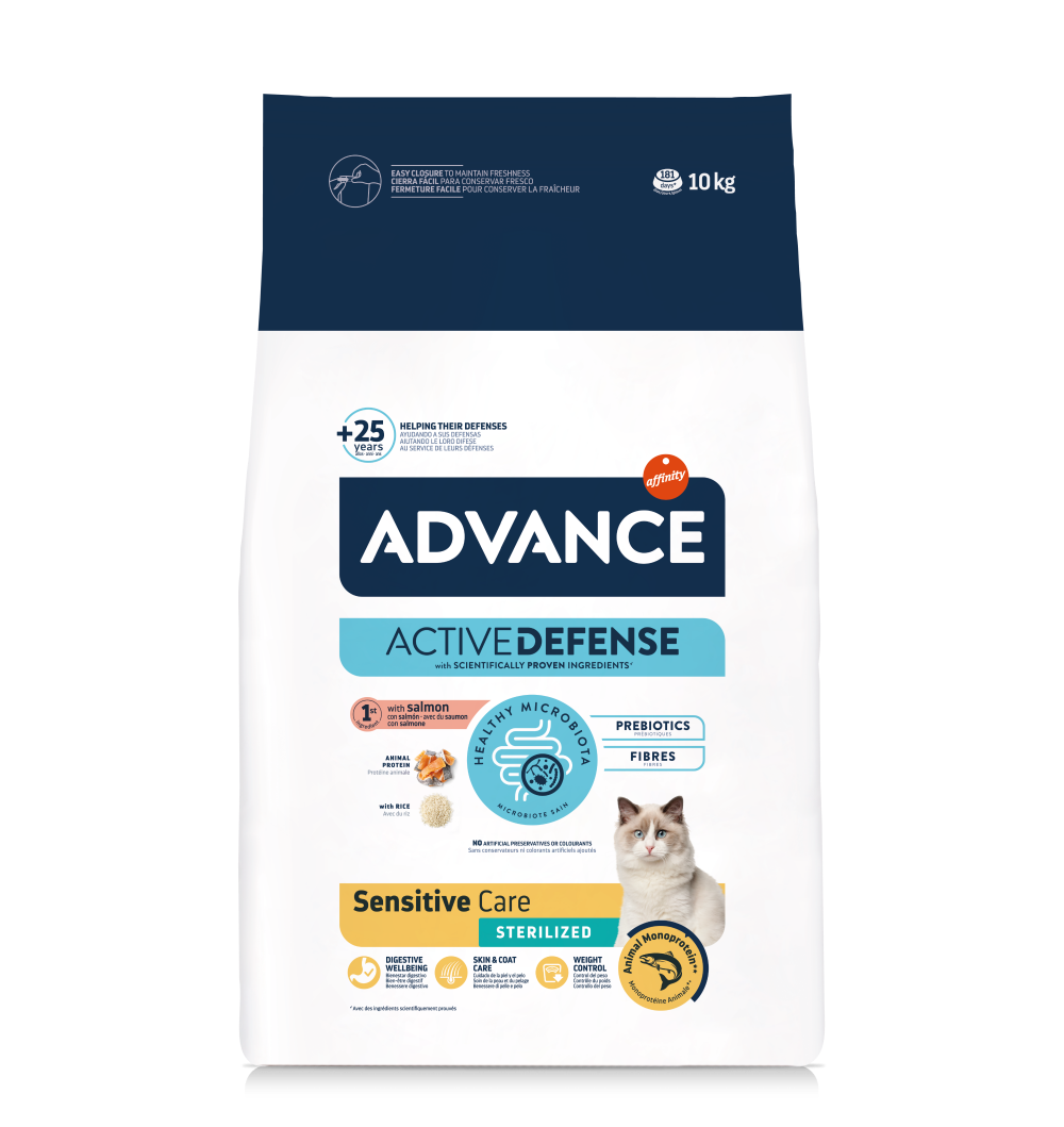 O Advance Sterilized Adult Sensitive Care é especialmente indicado para ajudar na digestão dos gatos adultos esterilizados. Foi elaborado com salmão como única fonte de proteína animal e com arroz. Uma receita monoproteica animal fácil de digerir, formulada sem soja nem ovo. Além disso, ajuda a controlar o peso graças ao teor de fibra e ao nível moderado de gorduras e calorias. Contribui para uma pele saudável e um pelo brilhante graças aos ácidos gordos ómega 6 e ómega 3 e ao zinco. O tamanho do croquete adapta-se à mandíbula dos gatos adultos.