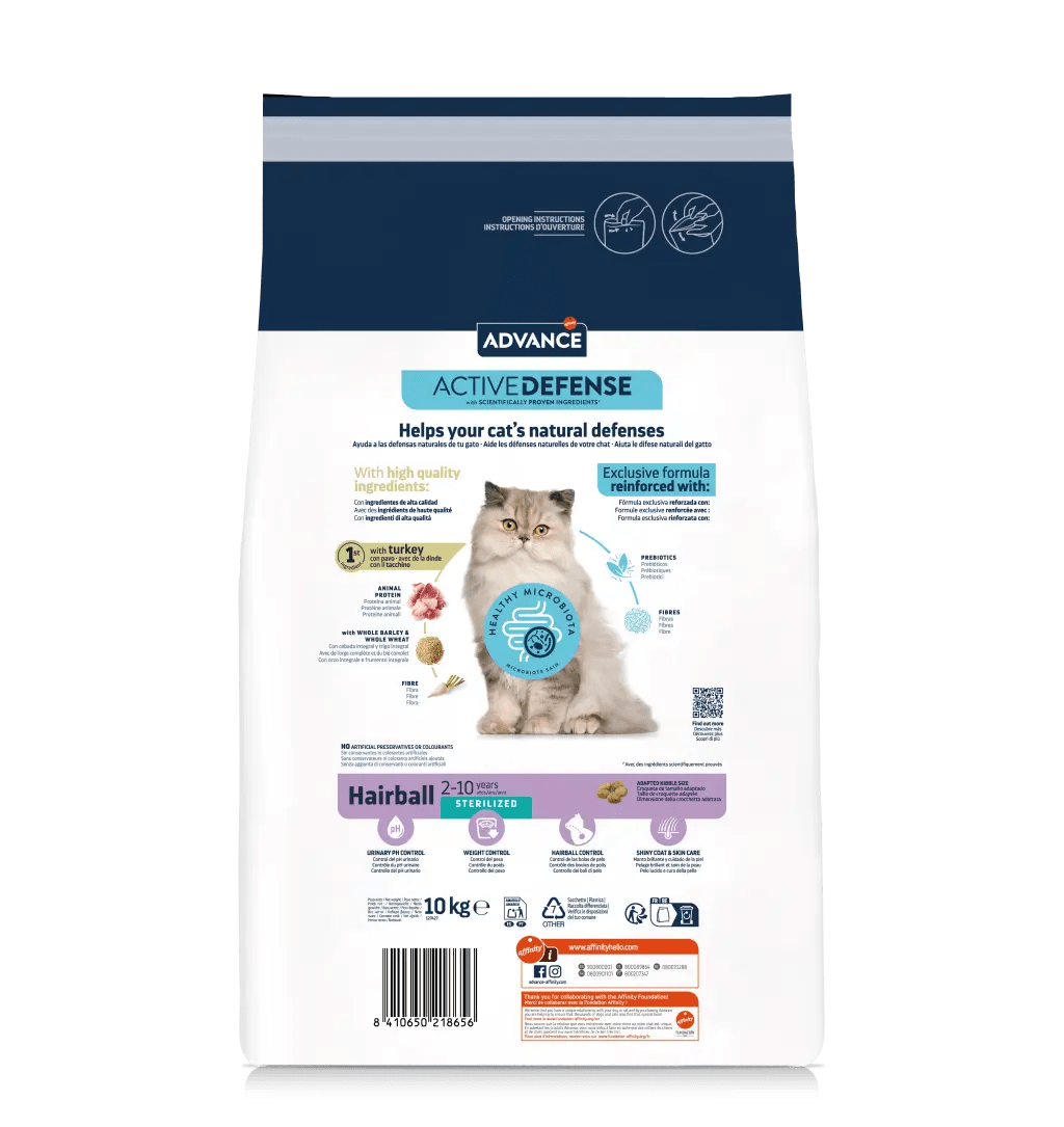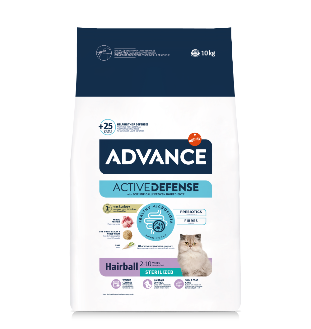 O Advance Sterilized Adult Hairball é especialmente indicado para ajudar a controlar as bolas de pelo em gatos adultos esterilizados. Graças ao elevado teor de fibra, facilita a eliminação de pêlo e, portanto, ajuda a reduzir a formação de bolas de pêlo. Também ajuda a controlar o peso porque tem um índice moderado de gorduras e calorias e controla o pH urinário porque contém níveis equilibrados de minerais. Além disso, contribui para o cuidado da pele e do pelo graças aos ácidos gordos ómega 3 e ómega 6 e ao zinco. O tamanho do croquete adapta-se à mandíbula dos gatos adultos.