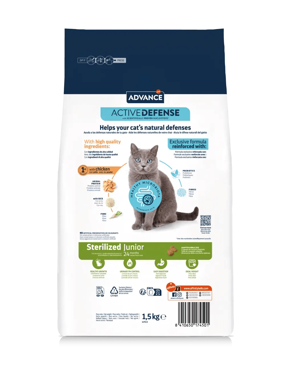 O Advance Sterilized Junior foi especialmente formulado para responder às necessidades nutricionais dos gatos jovens esterilizados. É um alimento fácil de digerir, que ajuda a manter o peso ideal graças ao teor de proteínas e calorias. Também ajuda no controlo do pH urinário porque contém níveis equilibrados de substâncias minerais. O tamanho reduzido do croquete adapta-se à mandíbula dos gatos jovens.