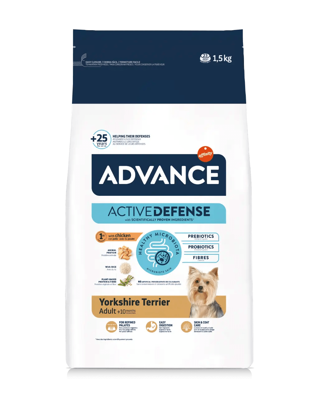 Advance Yorkshire Terrier foi formulado para o cuidado dos cães da raça Yorkshire. Uma receita com um sabor intenso e de fácil digestão, elaborada com maçã e presunto. Contribui para manter a barreira cutânea da pele graças ao colagénio, aos ácidos gordos ómega 6 e 3, à biotina e ao zinco. Além disso, contém antioxidantes para ajudar a neutralizar os radicais livres.