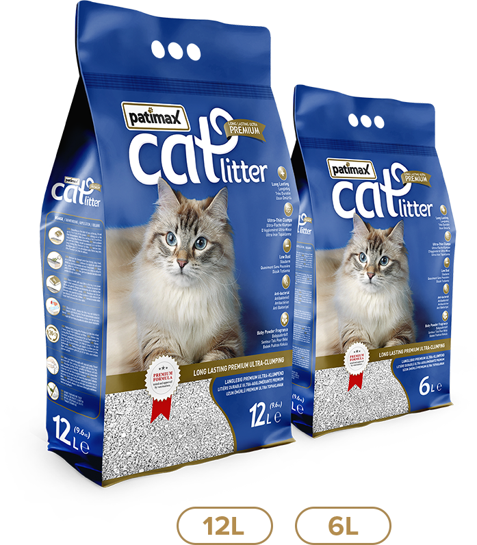 Patimax Premium, a areia para Gato Premium, natural e hipoalergénica, com aglomerados suaves, anti ácaros e baixa emissão de pó. Conforto, higiene e bem-estar diário!