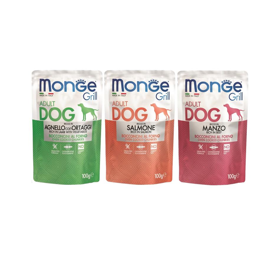 Alimento completo para cães adultos de todas as raças, com 4 saquetas de carne fresca de vaca, 4 saquetas de salmão e 4 saquetas borrego grelhados em pedaços e sem cereal.