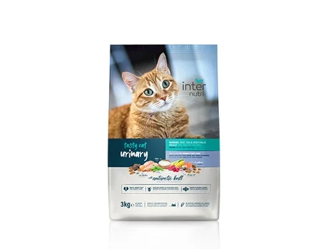 INTERNUTRI TASTY CAT URINARY é um alimento seco completo, elaborado tendo em consideração as características e necessidades nutricionais dos gatos com trato urinário sensível. Sem corantes nem sabores artificiais, a sua fórmula nutricionalmente equilibrada e segura traz os benefícios do krill do antártico, uma matéria-prima de origem sustentável, mantém pele e pelo saudáveis, reforça o desenvolvimento cerebral e o sistema imunitário.
