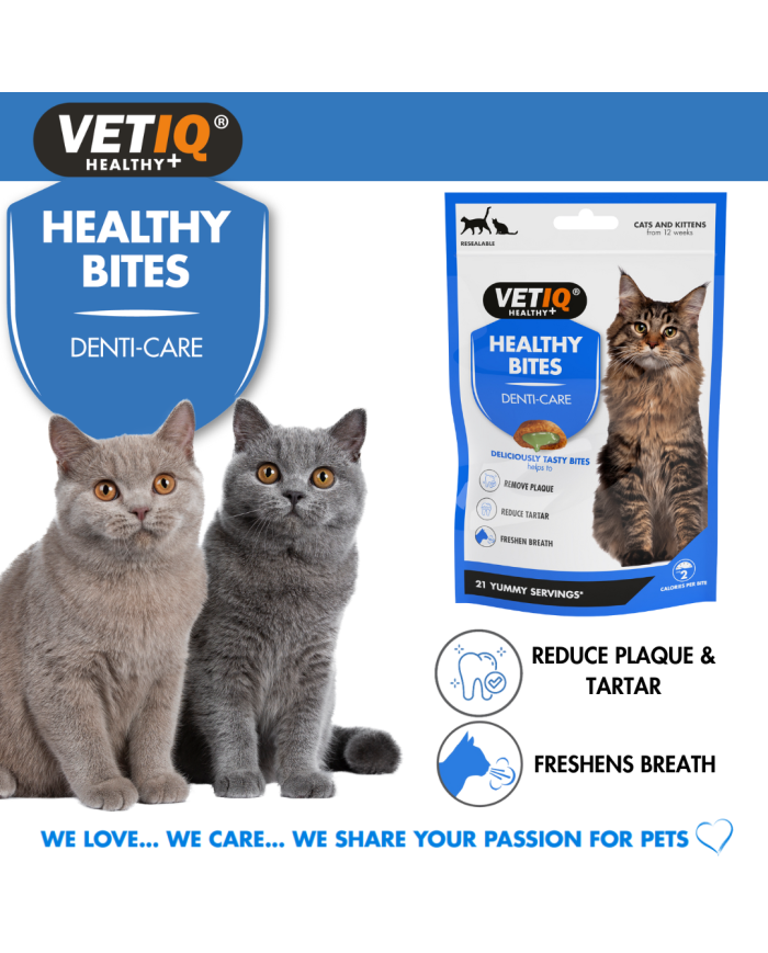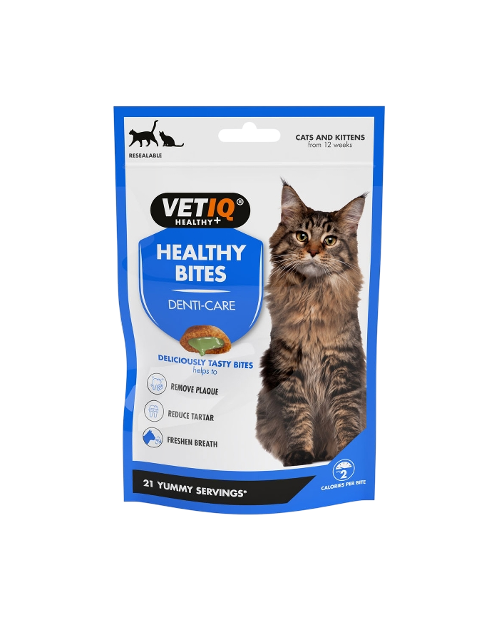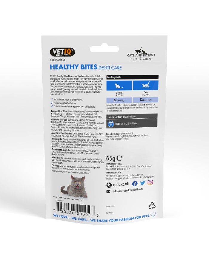 VETIQ Healthy Bites Denti Care Treats foi formulado para melhorar e manter a saúde dentária dos gatos e gatinhos. Têm uma casca exterior seca que, quando aberta, massaja as gengivas e raspa a superfície dos dentes, ajudando a prevenir a formação de placa bacteriana e a reduzir o tártaro. O centro recheado de creme contém uma pasta de creme nutritiva que contém agentes anti-microbianos naturais. Ajudando a prevenir a formação de placa bacteriana e contendo óleos de sementes de salsa e de cravinho para um hálito fresco, não é necessário escovar para ajudar a manter os dentes e as gengivas saudáveis para o seu amigo felino!